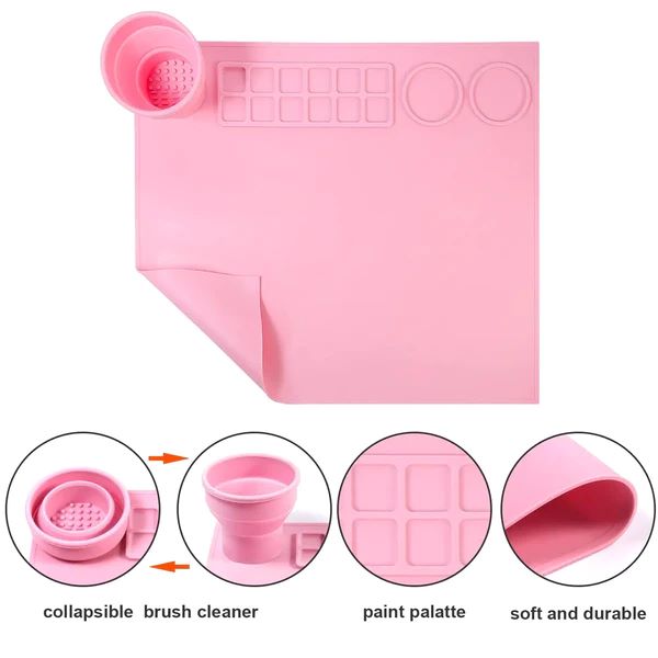 Primul nostru covoraș cu un pahar de curățare a pensulelor încorporat și pliabil. Paharul pentru curățarea pensulelor este conceput pentru a ține apă și a curăța pensulele.