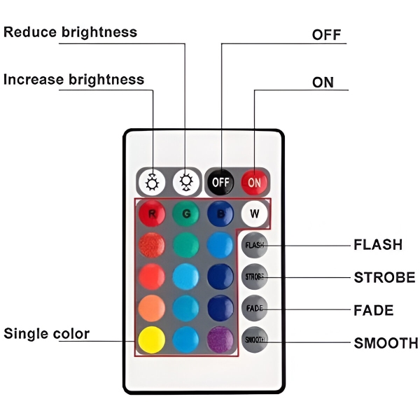 AQUASHEIN vine cu o telecomandă convenabilă care vă permite să ajustați iluminarea cu ușurință. Cu 24 de taste, puteți alege dintre 16 culori RGB și patru moduri dinamice (flash, stroboscop, estompare, lin). Controlați luminile de la o distanță de până la 10 metri, asigurând o personalizare fără probleme.